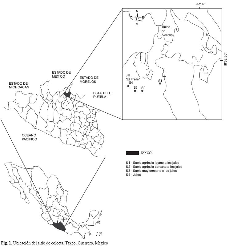 El área de estudio (Fig. 1) se ubica en Taxco, Guerrero, en la parte suroeste de México, donde existe una importante actividad minera. El área de muestreo está ubicada en el municipio 55, a 10 km al SO de la ciudad de Taxco de Alarcón, en la localidad de Santa Rosa. En esa zona se localiza el jale "El Fraile", en las coordenadas 18°31' 28.23" latitud norte y 99°37' 55.92" longitud oeste, a una altitud de 1664 msnm. Los suelos de la región pertenecen a la unidad edafológica feozem háplico (FAO 1977, INEGI 2005), son de clase textural media. El clima es cálido con lluvias veraniegas y con un régimen de humedad que va desde ligeramente húmedo hasta seco (SEMARNAP 2000, INEGI 2005).