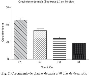 A los 70 días las plantas que mayor biomasa y desarrollo en crecimiento presentaron fueron las correspondientes a S1 con 10.9 g y 45.6 cm y a S2 con 5 g y 33.6 cm, mientras que las plantas de las condiciones S3 y S4 pesaron 3 g y midieron 24.2 cm y 2.3 g y 19.0 cm, respectivamente, y mostraron una disminución en el crecimiento a partir del día 15 (Fig. 2); el número de hojas en promedio encontradas fue de seis para las primeras dos unidades experimentales S1 y S2, y de cinco para S3 y S4. Esto muestra que los tratamientos S1 y S2 no presentaron diferencias entre ellos, de igual forma para S3 y S4 (p=0.05).