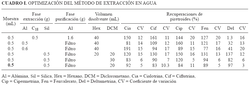 Para la optimización del método DMFS, para el análisis de piretroides en las matrices de agua y suelo, se utilizó como base el método empleado por Valenzuela et al. (2006), se establecieron las condiciones de trabajo del cromatógrafo de gases y del método de extracción y purificación. Se probaron diferentes fases sólidas (C18, alúmina y sílice), distintos disolventes (hexano y diclorometano) y varios volúmenes de elución (20, 30 y 40 mL), como se muestra en los cuadros I y II. En donde las recuperaciones mayores se obtuvieron con los siguientes parámetros: para el caso de la matriz agua se utilizaron 0.5 mL de agua y 0.5 g de sílice para la extracción, adicionada con 100 μL de la mezcla preparada con base en los LMP, y se eluyeron con 20 mL de diclorometano. Los porcentajes de recuperación obtenidos estuvieron en el rango del 83 al 97 % con coeficiente de variación menor al 11 %, como puede observarse en la cuadro I.
