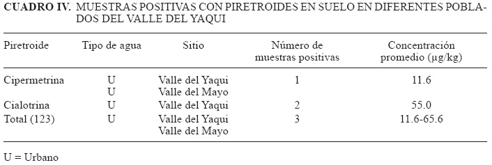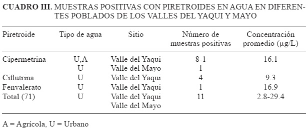 En lo que se refiere al Valle del Mayo se analizaron 16 muestras de las cuales 14 fueron de agua de uso urbano y 2 de uso agrícola, donde sólo una resultó positiva a cipermetrina con una concentración de 29.4 μg/L y pH de 9.3 (Cuadro III).