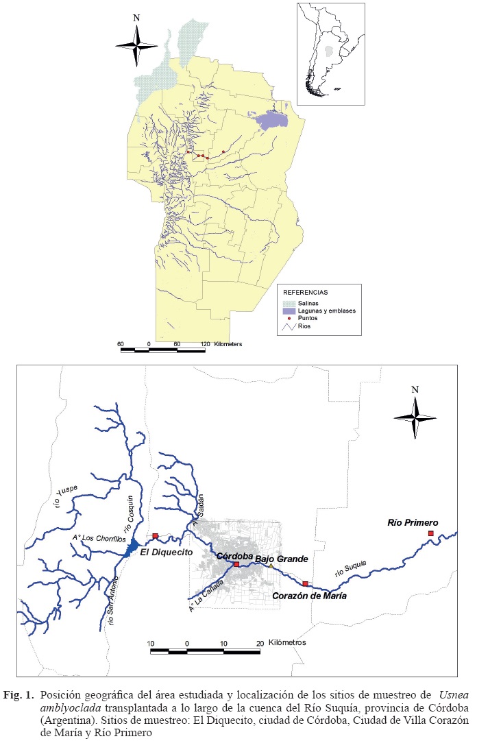 La capacidad biomonitora del liquen Usnea amblyoclada ha sido extensamente evaluada en relación a contaminantes urbanos e industriales (Carreras et al. 1998, 2005, Carreras y Pignata 2001, 2002), no así con relación a los compuestos presentes en cursos de agua y su potencial aporte a la atmósfera. Por ello, el objetivo del presente estudio es establecer la calidad del aire en una sección de la cuenca del río Suquía, mediante el biomonitor Usnea amblyoclada trasplantado durante el período invernal (estiaje).