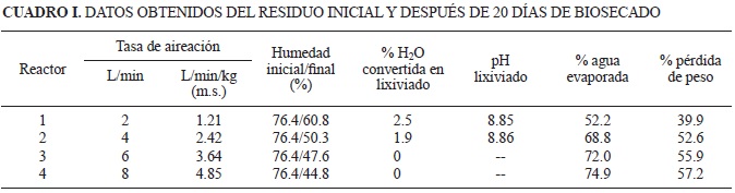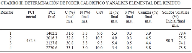 Los reactores se llenaron de césped segado con una humedad inicial del 76.4 %, reduciéndose después de 20 días hasta 44.8 % en el reactor 4 frente a 60.8 % del reactor 1 (Cuadro I). La disminución de volumen ha sido 45.5 % en el reactor 1, 59.1 % en el reactor 2, 61.4 % en el reactor 3 y 63.2 % en el reactor 4. Únicamente en los reactores 1 y 2 se generó lixiviado, obteniéndose 2.5 % de agua convertida en lixiviado en el reactor 1 y 1.9 % en el reactor 2, el resto se elimina como agua evaporada. Por otro lado, se determinó el PCI del residuo biosecado después de 20 días. El PCI se incrementó desde 452.45 hasta 1971.23 kcal/kg en el reactor 4 (Cuadro II).