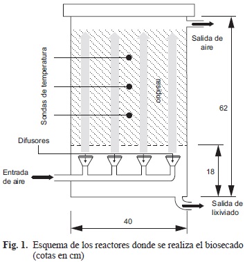 Cada reactor estaba repartido en dos compartimentos. El inferior ocupaba una altura de 18 cm y albergaba 4 difusores por los que salía el caudal de aire. En el compartimento superior se instaló una base metálica que funcionaba como sostén de los residuos, sobre la cual se depositó el volumen de muestra para biosecar.