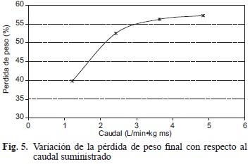 Sin embargo, a partir de los datos de la figura 2 el porcentaje de pérdida de peso aumenta en 31.8 % del reactor 1 al reactor 2, mientras que del reactor 2 al reactor 3 hay un incremento del 6.3 % y del reactor 3 al reactor 4 sólo del 2.3 %. La pendiente de las líneas que relacionan el porcentaje de pérdida de peso con respecto al tiempo varía en función del caudal de aire (Fig. 2).