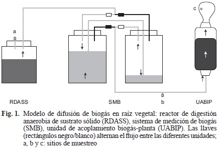 Se diseñó un modelo de análisis ex situ para demostrar el efecto del biogás en las raíces de calabaza, para ello se construyeron reactores de digestión anaerobia de sustrato sólido (RDASS) y aprovechar la producción de biogás simulando al generado en un RESA. El biogás se hizo circular en el sistema de medición del volumen de biogás (SMB) y luego fluyó a través de la unidad acoplada biogás-planta (UABIP) la cual contuvo el suelo artificial en el que se sembró y creció la calabaza, como se describe a continuación.
