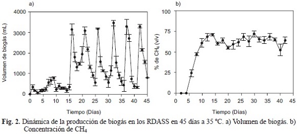 Se estableció que el volumen de biogás generado por los RDASS fue constante en el periodo entre cada alimentación a partir del día 15 de la dinámica de la DA de la FO de los RSU; con un volumen de 782 a 3200 mL/día, de los cuales 55 a 75 % era CH4 en el periodo de tiempo entre cada alimentación (Fig. 2).