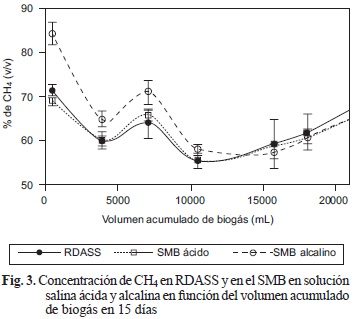 Se probó si la SS que se usó en el SMB a pH 4 ó 10 influyó en la concentración de CH4 en el biogás generado en cada RDASS. Haciendo uso de la SS alcalina aumentó la concentración de CH4 en función del volumen de la SS desplazada tras fluir por el SMB, que inicialmente fue 8 % mayor que en el RDASS, pero a partir del día 8 fue similar en los puntos de muestreo colocados antes y después del SMB (Fig. 3). Al finalizar el experimento se determinó el pH de la SS ácida, que subió levemente de 4 a 4.8 y el de la alcalina bajó drásticamente de 10 a 5.6, por lo que en las pruebas posteriores se usó la SS ácida.