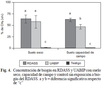 Se analizó si el biogás producido en cada RDASS fluyó por el sistema y fue constante en su composición luego de difundir en la UABIP bajo las dos condiciones probadas. En suelo seco la concentración de CH4 en la UABIP fue de 58 %, mientras que en capacidad de campo fue de 46 %, por lo que en esta última condición hubo una diferencia significativa en la composición, comparado con el biogás en el RDASS que registró un 63 % de CH4 en ambas condiciones (Fig. 4).