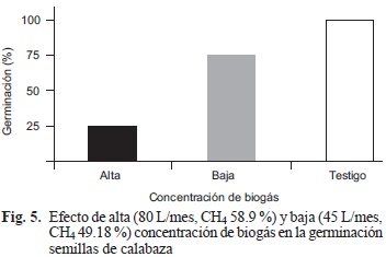 La germinación de semillas expuesta a elevada concentración fue de 25 % y, en contraste, la de baja concentración fue de 75 % comparada con las semillas de calabaza sin exponer al biogás usadas como control relativo (Fig. 5).