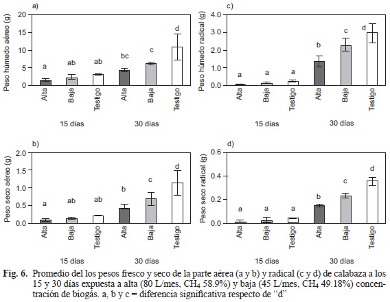 El biogás tuvo un efecto inhibitorio del crecimiento de plántulas de calabaza en función de la concentración de biogás y el tiempo de exposición, que no fue diferente en plántulas de 15 días, mientras que en 30 días la inhibición del expresado en biomasa fue evidente con aval de la prueba estadística (Fig. 6).