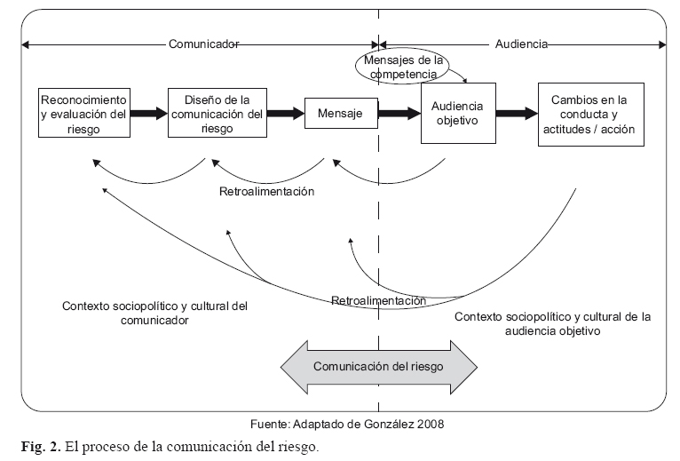 En la figura 2 tomada de González, podemos ver el proceso de generación y difusión de la información, considerando dos dimensiones claves: "comunicador" y "audiencia". Lo anterior agrega nuevos elementos, donde la comunicación de riesgo tiende a modificar conductas en las audiencias y en su medio, y a través de un proceso constante de retroalimentación va afectando también al comunicador y a su medio.