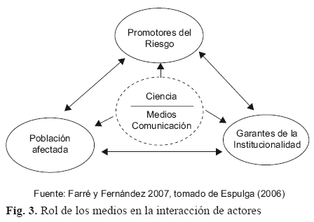 En la figura 3, que Farré y Fernández (2007) han tomado de Espluga (2006), se observan los roles que asumen los actores intervinientes en los procesos comunicativos, ya sean gestores o gestionados por el riesgo. De acuerdo con este esquema, los garantes institucionales, la población afectada y los promotores del riesgo interactúan mediados por los medios de comunicación y la ciencia como articuladores de los diálogos informativos. Recordemos que por medio del lenguaje los expertos hacen del riesgo (como código técnico) un conocimiento social generalizado y legitimado, y a partir de ello es posible establecer las acciones correspondientes para el manejo de los efectos indeseados que provoca la producción social, ejemplificada en temas como la contaminación atmosférica.