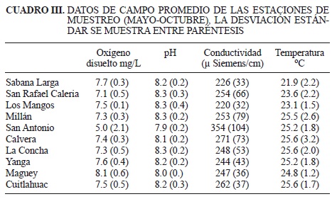Los datos de campo recabados muestran que la temperatura del agua de este río tropical fue en promedio 24.6º C, registrándose el valor más alto en mayo (31.7 ºC) y la temperatura más baja en septiembre 19.3 ºC. La estación San Antonio mostró en promedio los valores más bajos de oxígeno disuelto y valores más altos en conductividad. Los datos promedio por estación de muestreo de temperatura, conductividad, oxígeno disuelto y pH se muestran en el cuadro III.