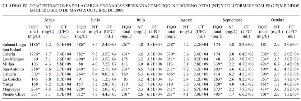 En el punto de afluencia del río San Antonio se observó una diferencia significativa con el resto de los puntos en relación con los parámetros de oxígeno disuelto y conductividad (Cuadro II), sin embargo no existieron diferencias significativas en relación con los parámetros de DQO, NT y CF (Cuadro IV). También se esperaba ver la influencia de los centros urbanos de Yanga y Cuitláhuac, sin embargo, con base en la escala de DQO todos los puntos de muestreo del río Seco fueron clasificados como contaminados o fuertemente contaminados. El 33 % de todas las muestras analizadas presentó valores de DQO entre 40 y 200 mg/L mientras el 67% restante presentó valores de DQO superiores a los 200 mg/L (CONAGUA 2011). En varios puntos de muestreo se encontraron valores alrededor de los 500 mg/L de DQO, es decir comparables a los encontrados en aguas residuales crudas (Metcalf y Eddy 1991).