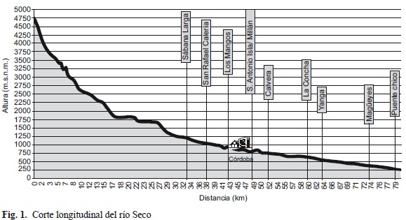 La longitud aproximada del río Seco desde su nacimiento hasta su entronque con el río Atoyac es de 70 kilómetros, y la longitud que abarca este estudio desde el primero al último punto de muestreo es de 47 kilómetros. En la figura 1 se observa el perfil longitudinal del río seco con la ubicación de los puntos de muestreo. Se da un abrupto descenso en la altitud desde el inicio del río, cerca de la comunidad de Tetezingo hasta el primer punto de muestreo Sabana Larga, es decir en 22.6 km hay una diferencia de 3500 m de altitud. Posteriormente es más suave el descenso en altitud habiendo una diferencia de 1250 m entre el primer y el último punto de muestreo.