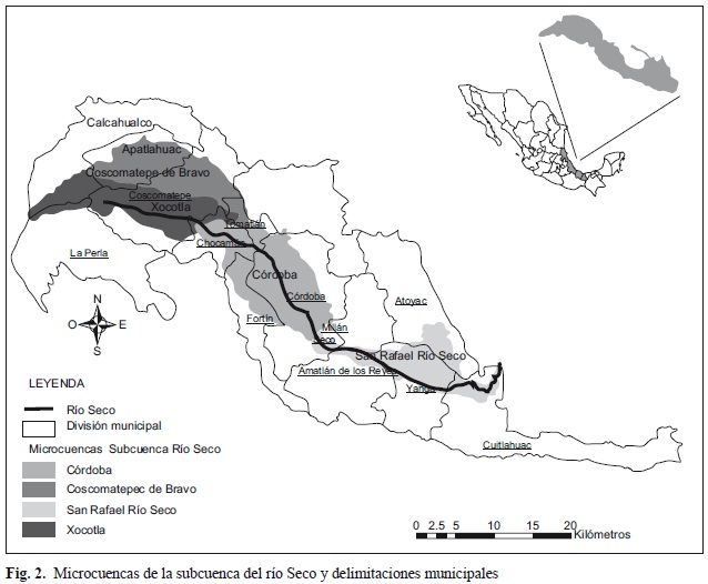 El área comprendida por la subcuenca del río Seco es de 43 816 ha. La vinculación de las divisiones hidrográficas a nivel microcuenca con los límites políticos administrativos se puede observar en la figura 2. Doce municipios tienen parte de su territorio en la subcuenca del río Seco. Estos son: La Perla, Calcahualco, Alpatlahuac, Coscomatepec, Chocamán, Tomatlán, Fortín, Córdoba, Amatlán de los Reyes, Yanga, Atoyac y Cuitláhuac. Las microcuencas que forman parte de la subcuenca del río Seco son cuatro: Xocotla, Coscomatepec, Córdoba y San Rafael Río Seco. La ubicación y dispersión de las localidades urbanas y rurales dentro de las microcuencas así como los puntos de muestreo se pueden observar en la figura 3.