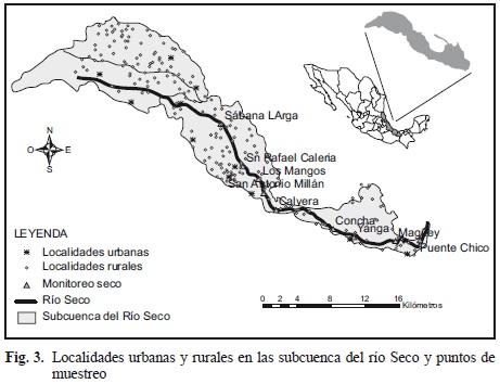 La subcuenca del río Seco, ubicada en el centro del estado de Veracruz en México, comprende un área de 43 816 ha donde viven aproximadamente 204 255 personas (cálculos propios a partir de INEGI 2010). La identificación de los 12 municipios que integran la subcuenca del río Seco así como la ubicación de las localidades rurales y urbanas (Cuadro I), da un panorama general de la distribución de la población en el territorio. Esta información es importante para la planeación de acciones de restauración, control de la contaminación y pago de servicios ambientales que servirían para un programa integral para la recuperación de la subcuenca.