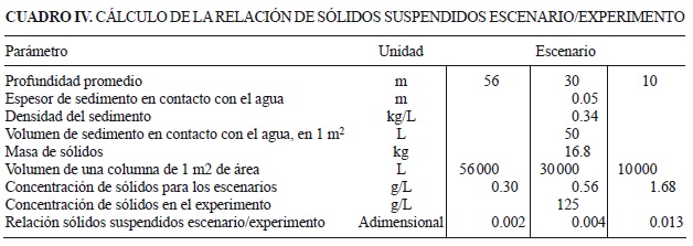 Los resultados experimentales de la liberación de metales en función del Eh fueron extrapolados a tres escenarios de profundidad promedio de agua, considerando la interacción con el agua de una capa de 5 cm de sedimento con densidad de 0.34 kg/L de peso seco, obtenida del análisis de densidad de un espécimen de sedimento inalterado (Cuadro IV). Se compararon los resultados obtenidos con los CECA (SEDUE 1989).