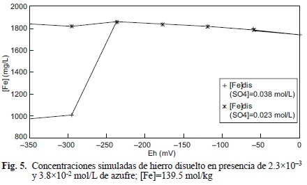 Los resultados obtenidos mediante modelación hidrogeoquímica de los sistemas agua-sedimento muestran aumentos en las concentraciones de los metales al disminuir el Eh. Los resultados obtenidos experimentalmente muestran también estos aumentos en la concentración disuelta, aunque nuevamente disminuyen cuando se reduce el Eh abajo de -214 mV. La diferencia entre los resultados experimentales y los de la modelación se puede explicar por la adición de (NH4)2SO4 como fuente de energía para disminuir el Eh experimental. A Eh de aproximadamente -214 mV, los sulfatos se reducen a sulfuros, que forman los sólidos mackinawita y pirita, que coprecipitan con, o adsorben a los metales, causando una disminución de las concentraciones disueltas. Para entender mejor este efecto se realizaron simulaciones de la distribución de hierro en presencia de la concentración de sulfato medida en campo (0.0023 mol/L; Cuadro VII) y las agregadas en el experimento (5 g/L = 0.038 mol/L de (NH4)2SO4; Cuadro III). Los resultados muestran que la adición experimental de sulfato causa la precipitación de hierro a partir de Eh = -236 mV (Fig. 5), mientras que esto no ocurre en presencia de la concentración de sulfato medida en campo.