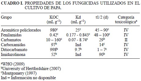 La información recopilada sobre el uso de fungicidas para el control de tizón tardío en el municipio de Zinacantepec reveló que los utilizados provienen de seis grupos químicos (Cuadro I). Dentro de estos destacan los carbamatos y las carboxamidas, que por ser de baja persistencia y de vidas medias cortas, tienden a adsorberse y acumularse en la materia orgánica, por lo que se espera que presenten poco peligro de contaminar a los cuerpos de agua, pero sí alta persistencia en el tubérculo. El grupo químico de las fenilamidas, al cual pertenece el metalaxil, presenta coeficiente octanol-agua (Koc) y constante de adsorción (Kd) bajos y alta persistencia (t1/2 alto). características que según la WHO (2009) implican mayor peligro por la facilidad para dispersarse y contaminar los cuerpos de agua. El grupo de los aromáticos policlorados y de las imidazolinonas, a los que pertenecen el clorotalonil y el fenamidone, respectivamente, presentan alta persistencia (t1/2 alto), baja movilidad y tienen mayor afinidad por los suelos (WHO 2009).