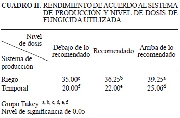 El análisis de varianza indicó que hay diferencias significativas en los rendimientos de producción de papa entre los dos sistemas de producción (riego y temporal), así como entre los niveles de dosis de fungicida utilizados en cada uno de estos (Cuadro II). En los sistemas de producción de riego que aplican los fungicidas por arriba de lo recomendado se obtuvo un rendimiento promedio de 39.25 ton/ha, lo cual representa casi el doble de producción que se obtiene en sistemas de temporal que aplican los fungicidas en dosis debajo de lo recomendado por el FRAC (Cuadro II). El costo promedio de producción en los sistemas de temporal fue de 76 170.00 pesos MXN/ha y en riego de 68 153.90 pesos MXN/ha, esta diferencia se debe a la frecuencia con la que se aplican los fungicidas en cada sistema tal como fue mencionado anteriormente. Considerando un valor de mercado por kg de papa de 5.00 pesos MXN (SIAP 2010), el ingreso libre promedio por hectárea de riego aplicando los fungicidas en dosis arriba de lo recomendado fue de 128 096.10 pesos MXN, y en la de temporal de 49 130.00 pesos MXN bajo el mismo nivel de dosis empleada de fungicidas, pero con intervalos de aplicación más cortos. El 80 % de la superficie del ciclo agrícola de riego también produce papa en temporal, generando así dos ciclos de cultivo en el mismo predio, por lo que una hectárea de doble ciclo agrícola genera un ingreso libre promedio de 177 226.10 pesos MXN al año.