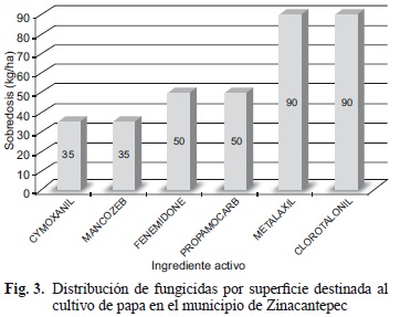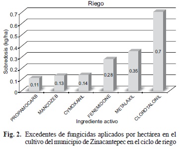 En la figura 2 se muestra, que el clorotalonil es el fungicida que alcanzó la más alta dosis en los predios de riego, con un excedente de 0.7 kg/ha de ingrediente activo, seguido por el metalaxil y el fenamidone con 0.35 y 0.28 kg/ha respectivamente. Además de lo anterior, el metalaxil y el clorotalonil fueron aplicados en el 90 % de la superficie total del cultivo de papa analizada, el fenamidone y el propamocarb en el 50 %, mientras que el cymoxanil y el mancozeb en el 35% (Fig. 3). En los predios de temporal el excedente de ingrediente activo de clorotalonil fue de 1.13 kg/ha (Fig. 4). para el metalaxil y el fenamidone de 0.65 y 0.52 kg/ha, respectivamente, lo que representa el doble de los excedentes aplicados en los predios de riego. Los predios de temporal se ubican en las partes más altas de las zonas productoras de papa, por lo que se presenta contaminación difusa, ya que dadas las propiedades químicas del metalaxil, es fácil su lixiviación y arrastre desde las partes altas hasta los cuerpos de agua (Fig. 1). El clorotalonil fue aplicado en el 90 % de las parcelas analizadas y sus niveles de uso son superiores a los reportados por Guenthner et al. (1999), quienes encontraron que en los Estados Unidos de América este compuesto fue aplicado en el 50 % de la superficie destinada al cultivo de papa, lo que demuestra que en la zona de estudio se siguen patrones de uso de fungicidas superiores a los de los países industrializados.