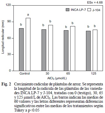 Este comportamiento indicó que 30 μmol/L es suficiente para afectar la longitud radicular en la variedad J-104 y que a partir de esta concentración se mantiene el efecto inhibitorio del Al en el crecimiento de la radícula, de manera tal que en las plántulas expuestas a 125 μmol/L se observó una reducción del 23 % en relación con las plántulas no tratadas. En la INCA LP-7 la longitud radicular no difirió entre ninguno de los tratamientos, por lo que esta variedad fue capaz de soportar dosis de hasta 125 μmol/L de AlCl3, sin tener afectaciones en la longitud de su radícula (Fig. 2).