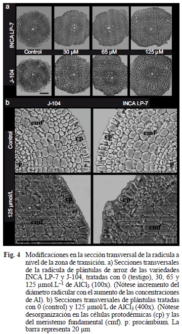 En la figura 4 se puede apreciar como este desorden se hizo más evidente con el incremento en los niveles de Al3+, de manera tal que en las plántulas de las dos variedades, expuestas a 125 μmol/L es difícil definir las capas celulares dentro de la estructura radicular.
