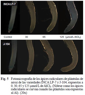 Las variedades INCA LP-7 y J-104 exhibieron una reducción significativa de este ángulo en las plántulas tratadas con las diferentes concentraciones del ion, en relación con las plántulas testigo y entre ellas. Además, este crecimiento asimétrico de los ápices se hizo más evidente con el incremento de los niveles de Al3+, de manera que las plántulas expuestas a la concentración más tóxica del ion, exhibieron la mayor curvatura (Fig. 6).