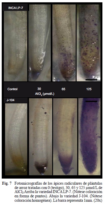 En las plántulas de la J-104 que fueron expuestas a 30 μmol/L de Al, se observó un comportamiento similar, ya que al igual que en la otra variedad, los ápices radiculares exhibieron solo la cofia coloreada. Sin embargo, las plántulas expuestas 65 μmol/L mostraron una coloración homogénea en el primer centímetro del ápice, correspondiente a la zona de división y las tratadas con 125 μmol/L mostraron sus ápices completamente coloreados, lo que indica una mayor cantidad de iones dentro del ápice radicular (Fig. 7).