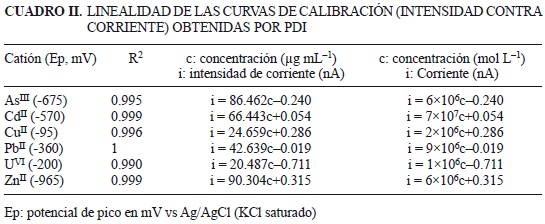 Una vez localizados los potenciales de pico de cada catión, se procedió a realizar sus curvas de calibración y se obtuvieron las ecuaciones de la linealidad de las gráficas de concentración contra intensidad de corriente, mostradas en el cuadro II. Se observa que hay una excelente correlación de linealidad, pues para cada curva es mayor a 0.990; el intervalo de confianza es muy pequeño, lo que indica que existe poca incertidumbre en los datos obtenidos y refleja un correcto manejo experimental.