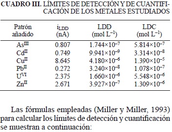 Los límites de detección para las intensidades de corriente (iLDD), los límites de detección para las concentraciones (LDD) y los límites de cuantificación (LDC) se incluyen en el cuadro III.