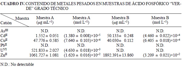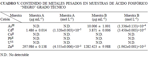 Las muestras de ácido fosfórico "Negro A" y "Negro B", contienen ZnII y CdII. El ácido fosfórico "Negro B" contiene además AsIII.