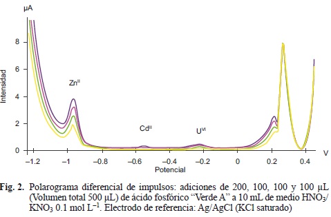 A modo de ejemplo, se presentan los polarogramas obtenidos para la cuantificación de los cationes en la muestra de ácido fosfórico "Verde A" (Fig. 2), detectándose ZnII, CdII y UVI. En el polarograma también se logró identificar la presencia de Fem y Cl- (señales ubicadas a potencial mayor a 0 V).
