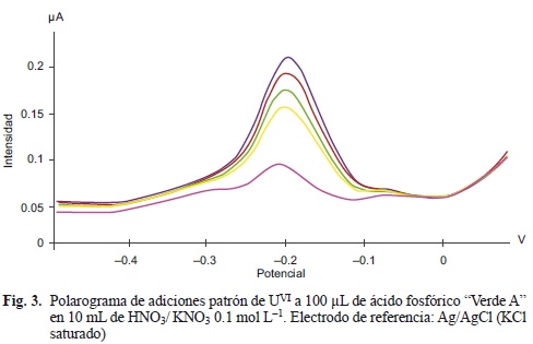 La figura 3 muestra que las adiciones de UVI patrón producen un aumento en el mismo potencial que el producido por las adiciones de muestra (ácido fosfórico "Verde A"); se observa también la presencia de cobre (potencial de -0.095 V) en el mismo polarograma, cuyas señales se van ocultando conforme se incrementa la cantidad de UVI agregado.