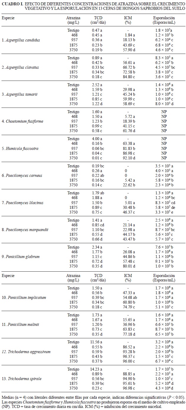 Abundancia de esporas. En ninguna de las cepas estudiadas la producción de esporas fue inhibida totalmente por las concentraciones de atrazina aplicadas. Con excepción de algunos casos, en la mayoría de las especies el número de esporas disminuyó a medida que aumentó la concentración de la atrazina. Paecilomyces carneus y T. aggressivum fueron las especies en las que la abundancia de esporas fue más afectada por la mayor concentración de atrazina. En las cepas de Penicillium glabrum y T. spirale (Cuadro I) los valores de abundancia de esporas en los tratamientos con la menor dosis de atrazina fueron significativamente mayores a los tratamientos testigo (F = 6.08, P < 0.05 y F = 63.85, P < 0.05, respectivamente).