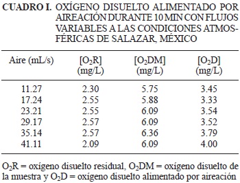 En el cuadro I se presenta el O2D que se alimenta a flujo variable (11.27, 17.24, 23.21, 29.17, 35.14 y 41.11 mL/s) y tiempo constante (10 min). El O2D alimentado se obtuvo de la diferencia entre el O2R y el oxígeno disuelto de la muestra (O2DM). Se apreció un valor mínimo de 3.33 mg/L y un máximo de 4.0 mg/L, el promedio fue de 3.6 mg/L durante los 10 min, por lo que para fines prácticos se determinó que la alimentación del O2D es independiente del flujo del aire y se alimentó a razón de 0.36 mg/L por min.