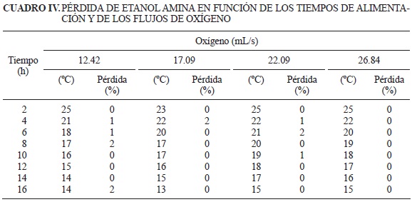 Cabe destacar que históricamente la EA al 30 % en solución acuosa se ha usado como estándar en la evaluación de la captura de CO2 de los gases de combustión debido a su capacidad de absorción de aproximadamente 50 % y a que en esta concentración se limita su viscosidad y su potencial de corrosión en los equipos convencionales de las plantas de captura (Bello e Idem 2005, Delfor et al. 2011 y Rochelle et al. 2011). Es por ello que en el presente trabajo se emplea la EA al 30 % en solución acuosa. Por otro lado, al considerar que la concentración máxima de O2D en el agua en las condiciones experimentales de Salazar Estado de México es de 6.9 mg/L, entonces el O2D que se alimente por aireación al sistema EA-H2O debe de tener valores inferiores a 6.9 mg/L. Es decir flujos entre 11.27 y 41.11 mL/s (Cuadro I) y para poder comparar los resultados, los flujos de oxígeno deben de ser similares a los flujos de aire.