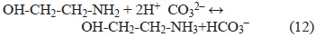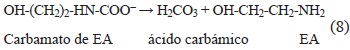 La pérdida de EA se explica como una consecuencia de las reacciones instantáneas que se llevan a cabo en el equilibrio del sistema EA-H2O-aire (ecuación 7) entre la EA con alguno de los componentes del aire como el CO2 o el O2 para formar el carbamato de EA, de acuerdo con Lawal et al. (2005) y Lepaumier et al. (2011).