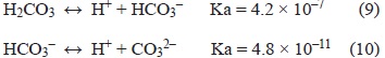 El ácido carbónico por ser un ácido diprótico se disocia en dos etapas de acuerdo con las ecuaciones 9 y 10.