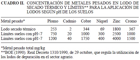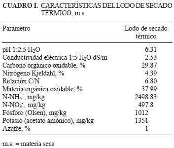 El lodo de depuradora de secado térmico provenía de las estaciones regeneradoras de aguas residuales de Madrid. Se determinó el pH en una relación suelo/agua = 1:2.5 y la conductividad eléctrica en una relación suelo/agua 1:5. El nitrógeno se determinó por el método de Kjeldahl (Ministerio de Agricultura, Pesca y Alimentación 1994). El nitrógeno inorgánico (N-NH4+ y N-NO3-) se determinó por destilación de arrastre de vapor (Bremmer y Edwards 1965). El carbono orgánico oxidable se determinó por el método de Walkey y Black (Ministerio de Agricultura, Pesca y Alimentación 1994). Asimismo, se determinaron directamente en el suelo el fósforo (P) por el método Olsen y el potasio (K) por acetato amónico (Ministerio de Agricultura, Pesca y Alimentación 1994). En el lodo el P y K totales se midieron por los procedimientos descritos por la AOAC (1997). La concentración de metales pesados en el lodo de secado térmico se presenta en el cuadro II. Los metales pesados y el azufre de los lodos se analizaron por plasma de acoplamiento inductivo (ICP-OES).