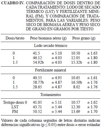 En el cuadro IV se presenta la comparación de medias de dosis dentro de cada tratamiento, así como la comparación de tratamientos para las variables peso de biomasa aérea (PBA) y peso de grano (PG). Se realizó el ajuste para comparaciones múltiples de Tukey-Kramer. Para PBA hubo diferencias significativas (p ≤ 0.05) con el tratamiento LST en la dosis 1.5 y con el tratamiento FM en la dosis 1. En la variable PG hubo diferencias significativas con LST para d1.5 y con FM para di. En la comparación entre tratamientos LST y FM no hubo diferencias significativas para ninguna de las dos variables PBA y PG.