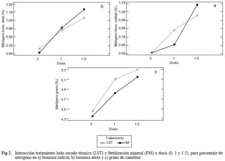 La respuesta a la fertilización residual en cuanto al contenido de nitrógeno del material vegetal de camelina: biomasa radical, biomasa aérea y grano, fue positiva en todos los casos para % NBR, % NBA y % NG, que aumentaron con la dosis de LST y de FM. Sin embargo, fue más evidente en % NG y con FM.