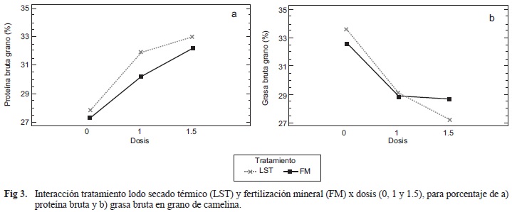 En la figura 3 se presenta la interacción tratamiento (LST y FM) y dosis (0, 1 y 1.5) para % PBG y % GBG de camelina. Se observa que el % PBG aumenta con la dosis de LST y de FM, aunque fue mayor para FM. Los valores máximos se obtuvieron con la d1.5 (33 y 32.3 % para FM y LST, respectivamente) y los menores fueron con la d0 (27.3 y 27.8 % para FM y LST, respectivamente). Sin embargo, para % GBG sucedió lo contrario, el mayor porcentaje se obtuvo con la d0 en ambos tratamientos (33.5 y 32.5 % para LST y FM, respectivamente) y los menores con la d1.5 (28.5 y 27 % para LST y FM, respectivamente). Gugel y Falk (2006) en el oeste de Canadá (Saskatoon, Scott y Beaverlodge) realizaron ensayos de campo con 19 cultivares de Camelina sativa y obtuvieron contenidos medios para % PBG de 27 a 32 % y para % GBG de 38 a 43 %. Los valores en el presente ensayo para % PBG fueron similares a los obtenidos por estos autores, pero los % GBG fueron menores al tratarse de un ensayo en tiestos y de otro cultivar.