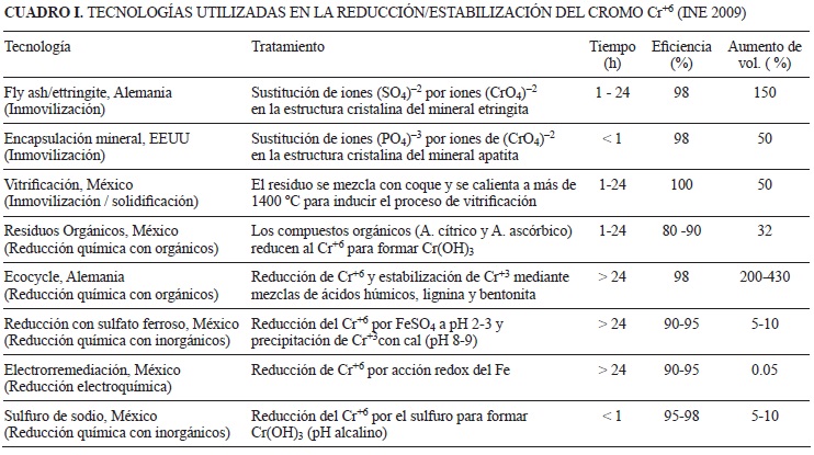 A nivel mundial se han desarrollo diversas tecnologías de reducción y estabilización del Cr+6 (Cuadro I), basadas en la conversión del Cr de un estado de oxidación al de reducción. Lo más común en lixiviados es llevar a cabo la reducción mediante iones ferroso, compuestos de sulfuro o compuestos orgánicos como ácido ascórbico, ácido cítrico, carbohidratos y ácidos húmicos (Eary 1988).