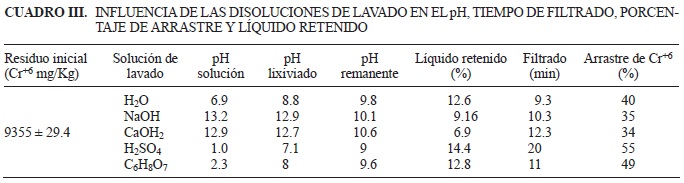 En el cuadro III, se presentan los valores promedio de pH en las soluciones de lavado, lixiviado y remanente, así como el porcentaje de líquido retenido y el de arrastre de Cr+6. Para la columna "pH solución", se ven las unidades propias de cada una, mientras que en la columna "pH lixiviado", se observa que el agua lixiviada tuvo un cambio de 1.9 unidades hacia valores alcalinos. Este efecto fue más notorio para las soluciones ácidas de H2SO4 y C6H8O7 las cuales varían 6.4 y 5.7 unidades de pH respectivamente. En cambio para las soluciones alcalinas la variación es menos significativa, 0.3 unidades de pH para el NaOH y 0.2 para el CaOH2.
