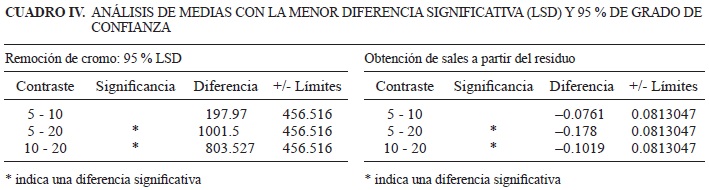 El cuadro IV muestra el resultado del análisis de medias donde se aprecian las diferencias significativas con un 95 % de confianza entre los valores utilizados para el tratamiento. En los dos casos mostrados se aprecia que no existe una diferencia significativa entre los niveles 5 y 10. Sin embargo, ambos difieren estadísticamente con los otros niveles.