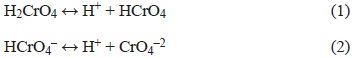 Las características físicas y químicas del suelo se aprecian en el cuadro II, donde se muestra una concentración de al menos 9355 mg/kg de Cr+6,lo cual excede 18 veces el valor limite establecido en la NOM 147 - SEMARNAT/SSA1-2004 para suelos industriales (510 mg/kg). Por otra parte, se aprecia que el 58 % de las partículas poseen tamaños mayores a 10 mm, lo que dificulta el proceso de lavado si se piensa en un sistema de tratamiento a gran escala. Estos resultados corroboran la fuerte dependencia del pH en reacciones redox según lo descrito por autores como Bartlett y Kimble (1976) y Adriano (2001) donde en condiciones neutras el Cr+6 existe como H2CrO4, HCrO4- y CrO4-2 con valores de pK de 0.86 (reacción 1) y 6.51 (reacción 2).