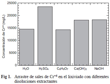 Los resultados obtenidos en las pruebas se presentan en la figura 1, donde la mayor concentración de Cr+6 en el lixiviado corresponde al lavado con solución de H2SO4. Seguido por las disoluciones alcalinas, las que no muestran una diferencia significativa pese a la disponibilidad de distintos iones de cada disolución como se aprecia para el Ca(OH)2 o el NaOH. Lo anterior indica una débil interacción de estas especies con el metal de interés. En el caso del C6H8O7 (ácido cítrico) este parece tener una baja eficiencia en el arrastre de cromo. Sin embargo, este resultado puede deberse a que el ácido cítrico no sólo disuelve el Cr soluble, sino que puede transformarlo a Cr+3 o a otras formas debido a su potencial redox, provocando que no sea cuantificado (Xing ru et al. 2012).