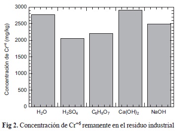 Como se puede apreciar en la figura 2, la disolución de H2SO4 es la que mayor capacidad de arrastre posee, con la concentración de cromo más baja en el residuo (2059 mg/kg). Mientras que para las disoluciones alcalinas se consiguen concentraciones parecidas, donde las más altas corresponden a 2845 mg/kg para el NaOH y 2891 mg/kg para el Ca(OH)2 lo que demuestra que son las menos eficientes en el proceso de lavado y arrastre del cromo.